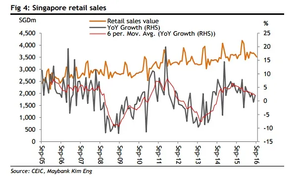 According to Maybank KimEng, various consumer confidence monitors for the Singapore market point to a material drop in consumer sentiment through 1H16.