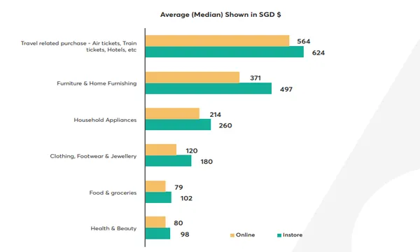 For furniture & home furnishing, Singaporeans spent an average of $497 for in-store purchases and $371 when they buy it online. Notably, Singaporeans spend less for health and beauty products as their purchases hit $98 on average for in-store transactions and $80 for online transactions.