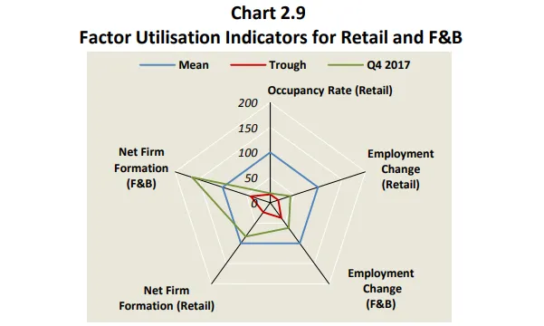In Q4 of 2017, only the net firm formations of F&B firms has improved and surpassed the indicator's mean. The occupancy rate in retail was still close to the trough, indicating continued weakness in the sector.