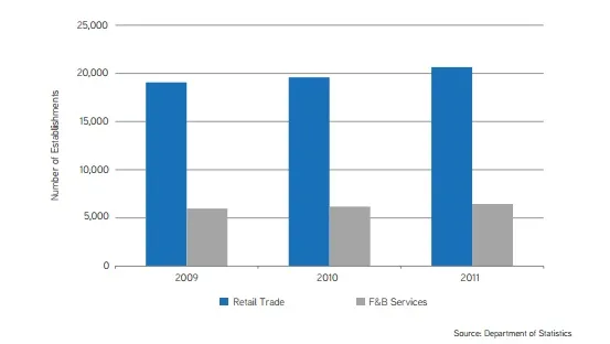 According to Colliers International, based on the latest available data, the number of retail trade establishments rose 8.3% from 19,069 in 2009 to 20,648 in 2011, even though part of this three-year period included the duration of poor sentiment as a result of the global financial crisis.