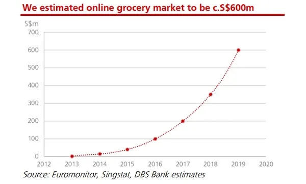 This chart from DBS Group Research showed that online grocery sales have hit $600-$637m as of February 2020. This is based on data from the Department of Statistics (SingStat), which revealed that online grocery sales account for 8.5% of the $7.5b in total supermarket sales.