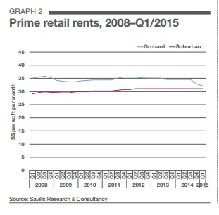 According to a report by Savills, despite the positive retail sales performance in Q1/2015, prime retail rents in Orchard Road dipped 2.0% QoQ to S$32.2 per sq ft per month. This could be attributed to the fall in tourist numbers as tourists form an important target segment for the Orchard shopping belt.