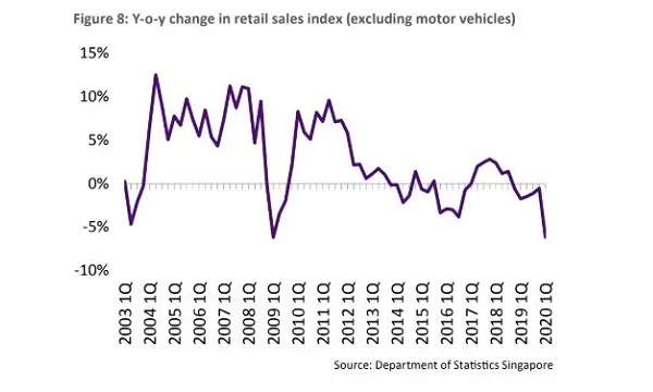 This chart from EDMUND TIE shows that the retail sales index (excluding motor vehicles) fell for the sixth consecutive quarter by 6.2% YoY in Q1. Overall, the total retail sales (excluding motor vehicles) declined by 33.4% YoY in April.