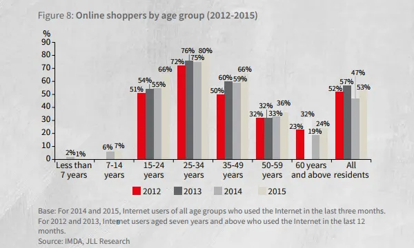 This chart from JLL shows the proportion of online shoppers amongst Singaporean residents played around 52% to 53% within 2012 to 2015.
