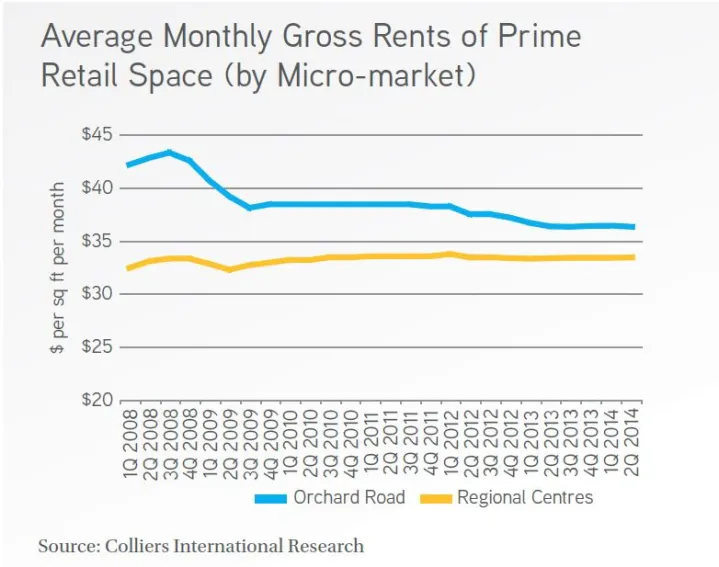 During the same period, the monthly gross rents for prime retail space in Orchard Road moved in the opposite direction, correcting by 0.2% from the $36.50 per sq ft recorded three months ago, to $36.42 per sq ft in 2Q 2014.