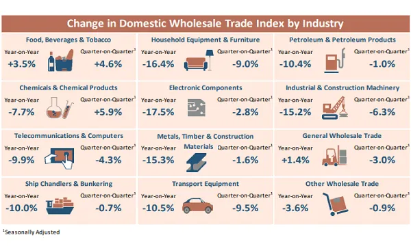 The decline was mainly attributed to dampened demand as a result of the COVID-19 outbreak. Most of the wholesale industries recorded lower domestic sales during the quarter.