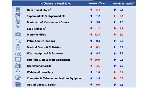 Conversely, sales in the wearing apparel & footwear industry rose 4.3%, due partly to higher demand for bags & footwear. Sales from mini-marts & convenience stores, watches & jewellery and computer & telecommunications equipment and supermarkets & hypermarkets recorded higher sales of between 1.2% and 3%.