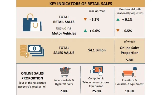 Retail sales dipped 5.3% YoY to $4.1b in January despite a 0.1% MoM rise, according to data from the Department of Statistics (SingStat). Excluding motor vehicles, retail sales increased 0.6% YoY.