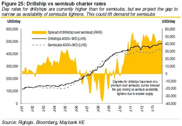 According to Maybank Kim Eng, tecent orders for deepwater floaters have been skewed towards drillships (44 on order) rather than semisubs (14 on order).