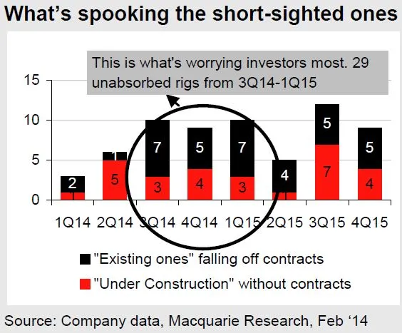 However, what’s spooking the market is that 28/85 rigs under construction that do not yet have jobs are coming on board in 2014-15. In addition, out of the 122 contracted ones, 36 will fall off contracts in 2014-15.