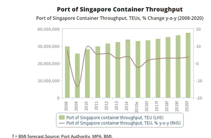 According to BMI Research, the port of Singapore is expected to recover from its troublesome performance in 2015 and record positive growth this year, as sizeable Asian trade and improved European demand will benefit the port's well established shipping connections and highly developed infrastructure.