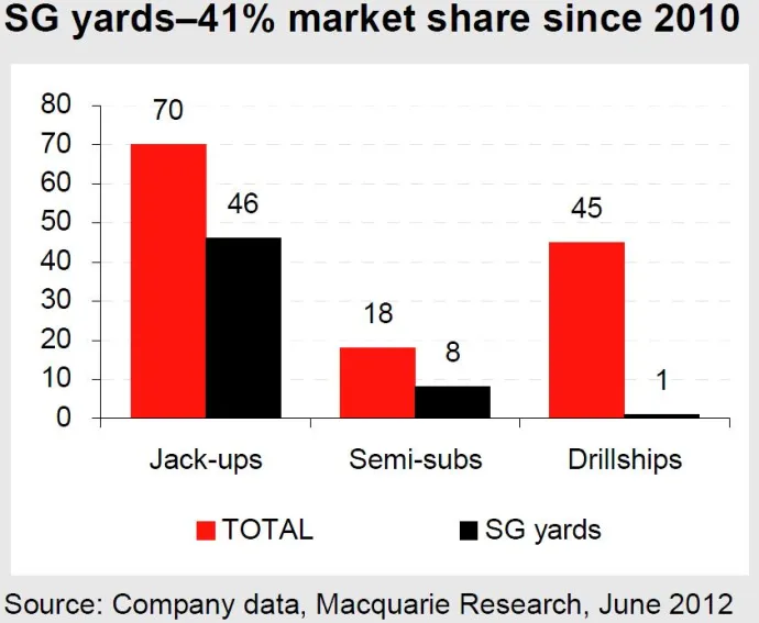 SG yards have bagged 41% of the 133 rigs ordered since 2010. Building highspec jack-ups is their domain (100% market share in global orders in 2012) while they continue to penetrate in the floaters market (Semis and Drillships).