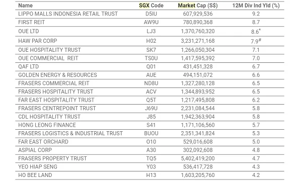 These five non-REITs/trusts are identified to be OUE (8.6%), Haw Par (7.9%), QAF (6.7%), Golden Energy and Resources (6.6%) and Hong Leong Finance (5.7%) whose average indicated yield of 12M hit 7.1%.