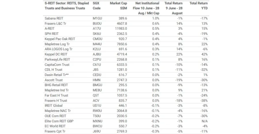 Singaporean REITs received $147m in net institution outflows since 9 June to 28 August, according to data from the Singapore Exchange (SGX). This is a 3% decline compared to the peak recorded in the i-Edge S-REIT Leaders Index forum from 23 March to 9 June.