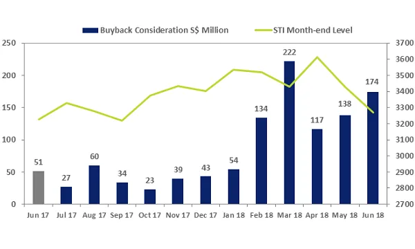 This chart from SGX Research shows that 33 Singapore-listed firms bought back their own shares in June 2018 for a total of $174m. The buyback consideration was up 26% from $137.9m in May and the third highest reported monthly consideration since September 2015.