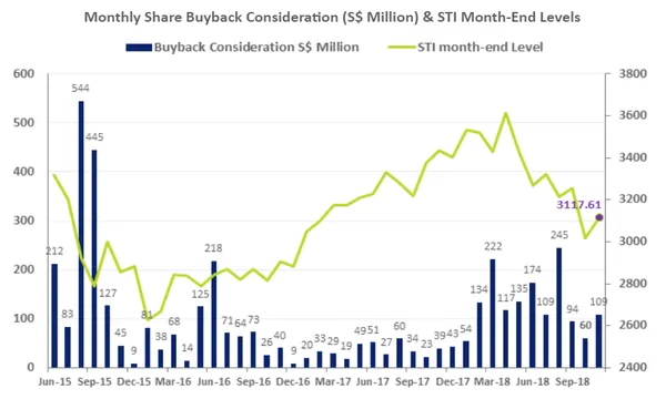 This chart from the Singapore Exchange (SGX) shows that total share buybacks in November climbed 81.67% MoM to $108.8m from $60m in October.