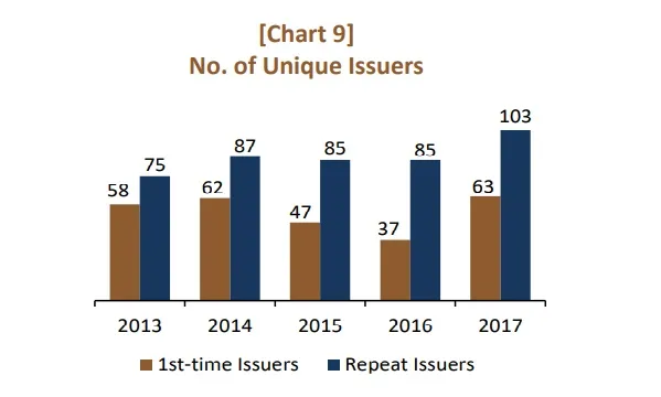 Issuances in Singapore's debt market rebounded from its declining trend over the past few years as first-time issuances grew 41% to 63 in 2017 from 37 in 2016 whilst repeat issuances jumped 21% to 103 in 2017 from 85 in 2016, the Monetary Authority of Singapore (MAS) revealed.