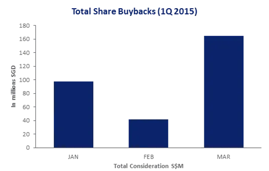 For the first two months of 2015, there were a total of 141,231,410 shares repurchased by 35 stocks, with a total consideration of S$139.1 million.