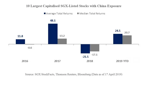 The top ten largest SGX stocks that have a majority of their revenue or base most of their assets in China are showing signs of bouncing back after outpacing the Straits Times Index (STI) with an average of 24.5% in total returns from a decline of 21.5% in 2018, according to SGX.