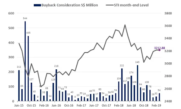 This chart from SGX showed that the total share buyback consideration in March totaled $53.5m, where there were 27 SGX-listed stocks that reported buybacks of their SGX-listings over the month, buying back a total of 49.8 million in shares or units.