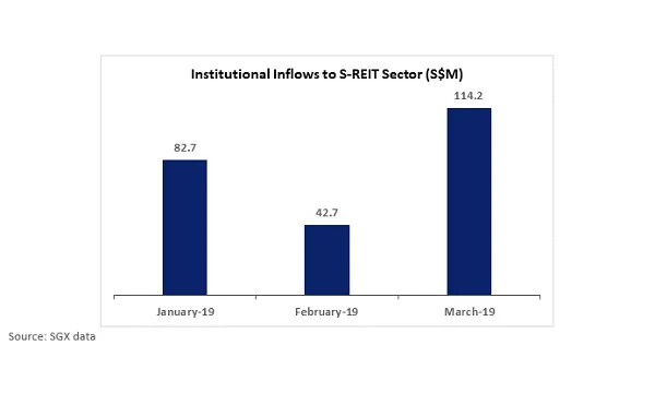 This chart from SGX shows the net institutional inflows of Singapore REITs in the months of January, February and March, reaching $82.7m, $42.7m, and $114.2m respectively.