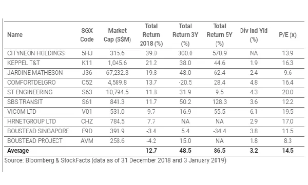 SGX noted that the three best performers amongst the top ten were City Neon (+39%), Keppel T&T (21.2%) and Jardine Matheson (+19.8%). The top three saw total average returns of 26.7% in 2018.