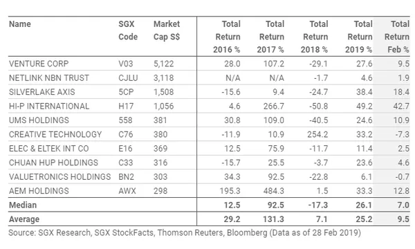 This chart from the Singapore Exchange (SGX) shows that the top 10 largest capitalised tech stocks saw average total returns of 25.2% in February YTD. On an MoM basis, the stocks hit average returns of 9.5%.