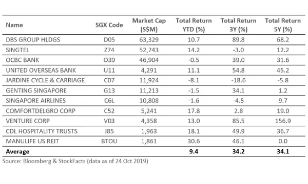 Manulife US REIT leads the pack with a YTD total return of 30.6%, followed by CDL Hospitality Trusts at 18.1%, ComfortDelGro at 17.8%, Singtel at 14.2% and Venture Corp at 13%.