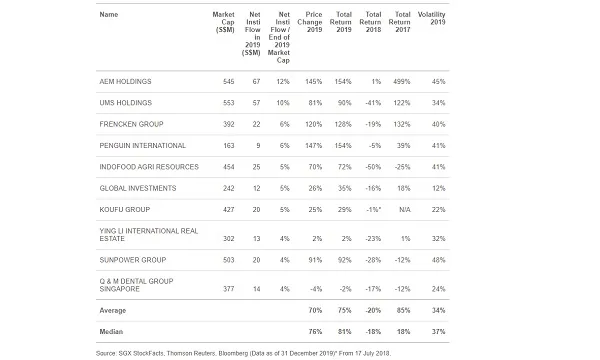 The top 10 small-cap stocks with the highest inflow proportionate to their market cap posted an average total return of 75%, with eight far outpacing the Straits Times Index’s (STI) 9.4% in 2019. They also accounted for almost a third of the combined turnover of Singapore’s small-cap stocks in 2019.