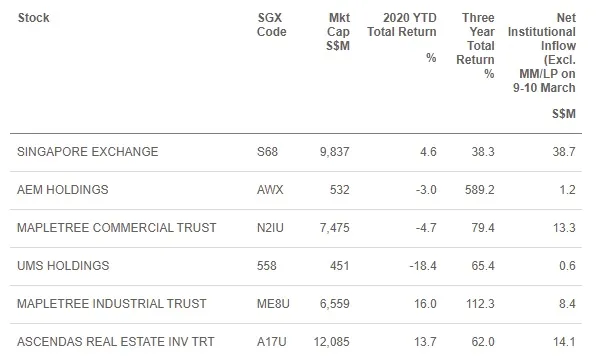 However, these stocks were still able to generate net institutional flows in 2020 YTD. SGX generated the highest amount at $38.7m, followed by Ascendas Real Estate Investment Trust at $14.1m, MCT at $13.3m and ST Engineering at $5.2m.