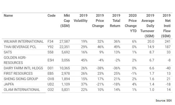 SGX noted that Wilmar International, Japfa and Golden Agri Resources have led the ten for the first eight sessions of 2020, whilst Sheng Siong Group, Koufu Group, SATS and First Resources all reported at least four-fifths of their revenue to Singapore. These four stocks saw $88m in net institutional inflow in 2019, with median total returns of 22%/23%.