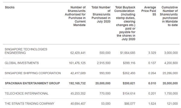 Spackman Entertainment Group bought back the highest number of shares at 20 million, collectively garnering $200,621.