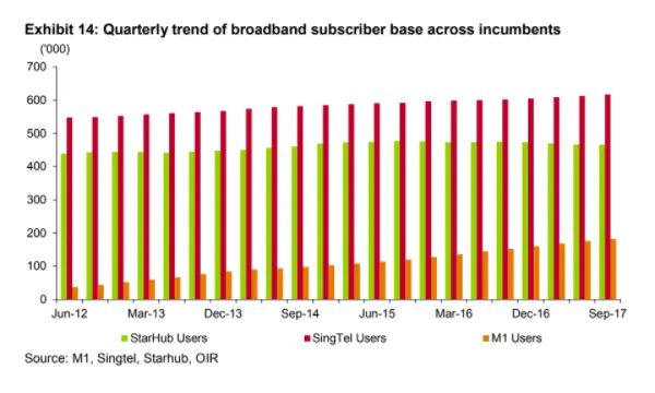 Chart of the Day: StarHub's broadband subscribers lags Singtel and M1