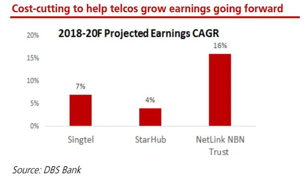StarHub's profits are forecasted to grow the slowest CAGR growth of 4% from 2018-2020, analyst Sachin Mittal said in a research note. A separate report by UOB Kay Hian notes that the telco's aggressive operational efficiency programme is expected to generate $210m in savings over the next few years that could prop up its weakening businesses.