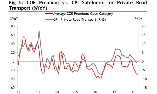 The consumer price index (CPI) for private road transport fell to -0.5% in March 2018 from +0.6% in February 2018. The average COE premium for open category vehicles fell by nearly 30% in March, according to Maybank KE's calculations.
