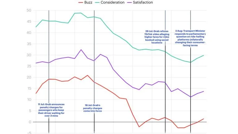 The Buzz score, which measures whether consumers heard positive or negative things about a brand for the past two weeks, showed Grab’s score to fall from 17.9 in 18 July to -2.6 in 1 August.