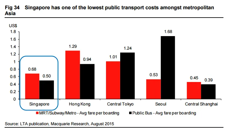 This chart from Macquarie shows that average bus fares in Singapore stand at just US$0.50 cents per boarding, compared to US$0.94 in Hong Kong, US$1.24 in Central Tokyo, and US$1.68 in Seoul.