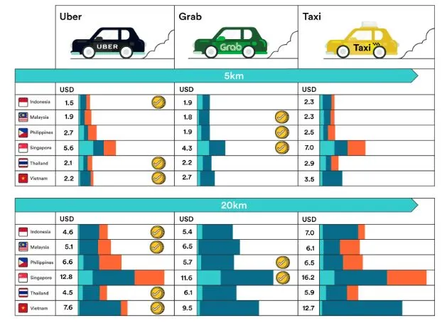In Singapore, Grab appears to be a cheaper option for both 5km and 20 km distance at US$4.3 (S$6.13) and US$11.6 (S$16.54).